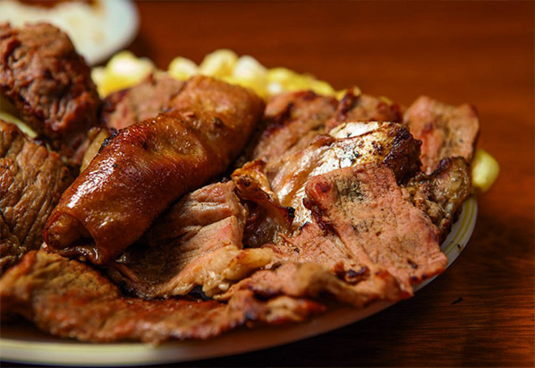 Cortar la carne en tiras largas y condimentar con la sal y la pimienta. Luego asarla a la plancha. Preparar una ensalada con la cebolla, tomate, hojas de quirquiña y el queso. Servir la carne acompañada de mote, choclo y ensalada.