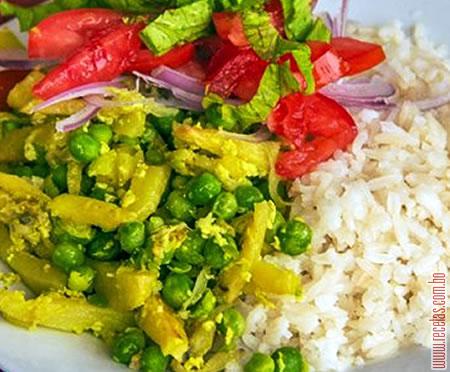 Pelar y hacer cocer las arvejas. Pelar las papas, cortar en tiras finas y freír en aceite caliente. Preparar un rehogado con aceite, cebolla y condimentos. Añadir las arvejas y los huevos enteros. Mezclar y por último agregar las papas fritas, el queso y el perejil. Remover y servir.